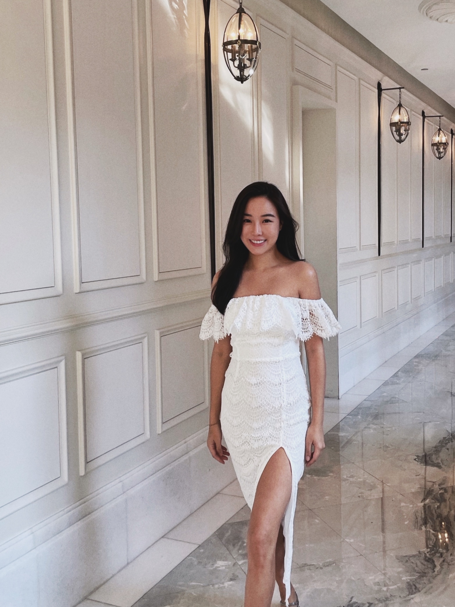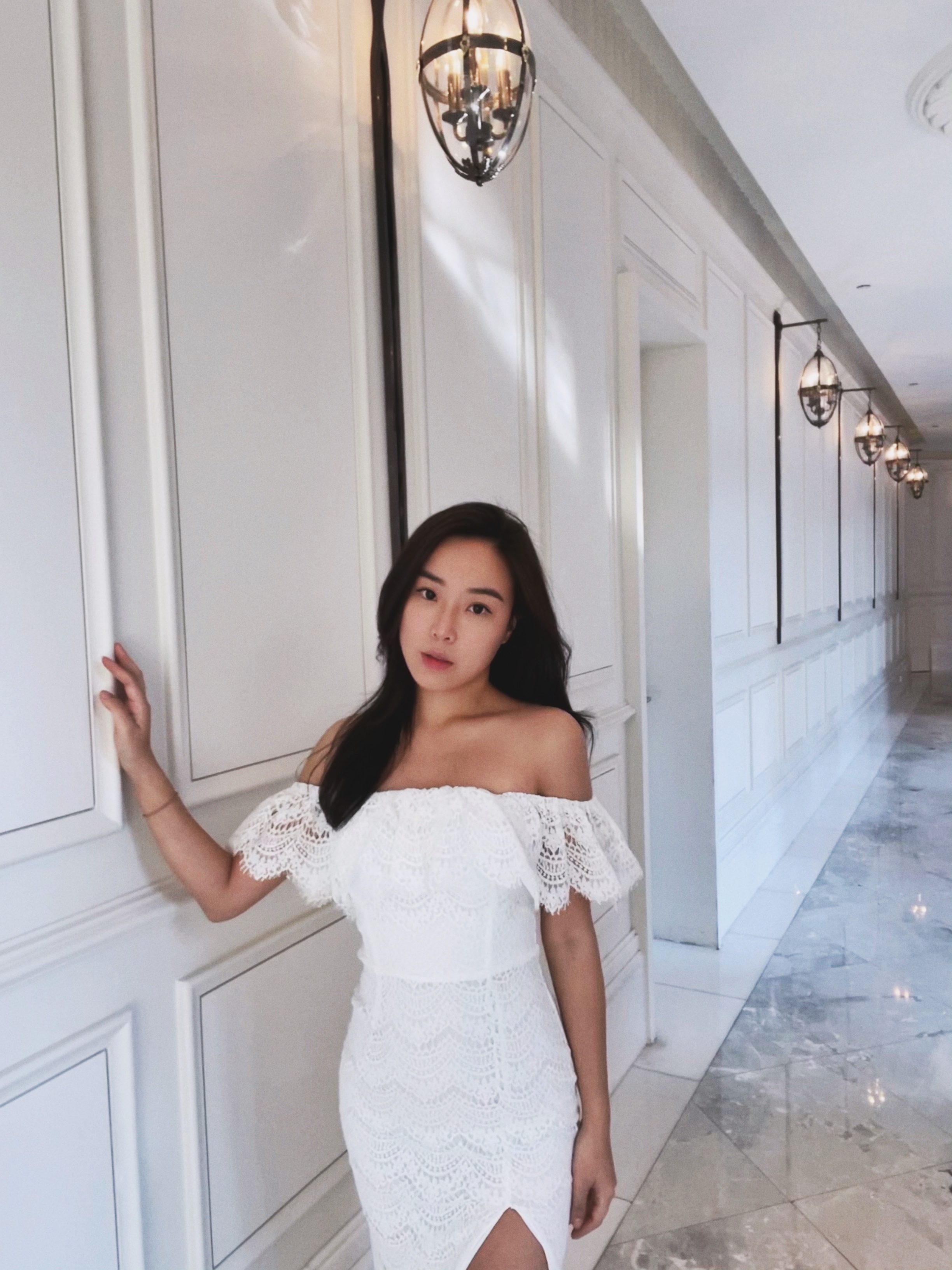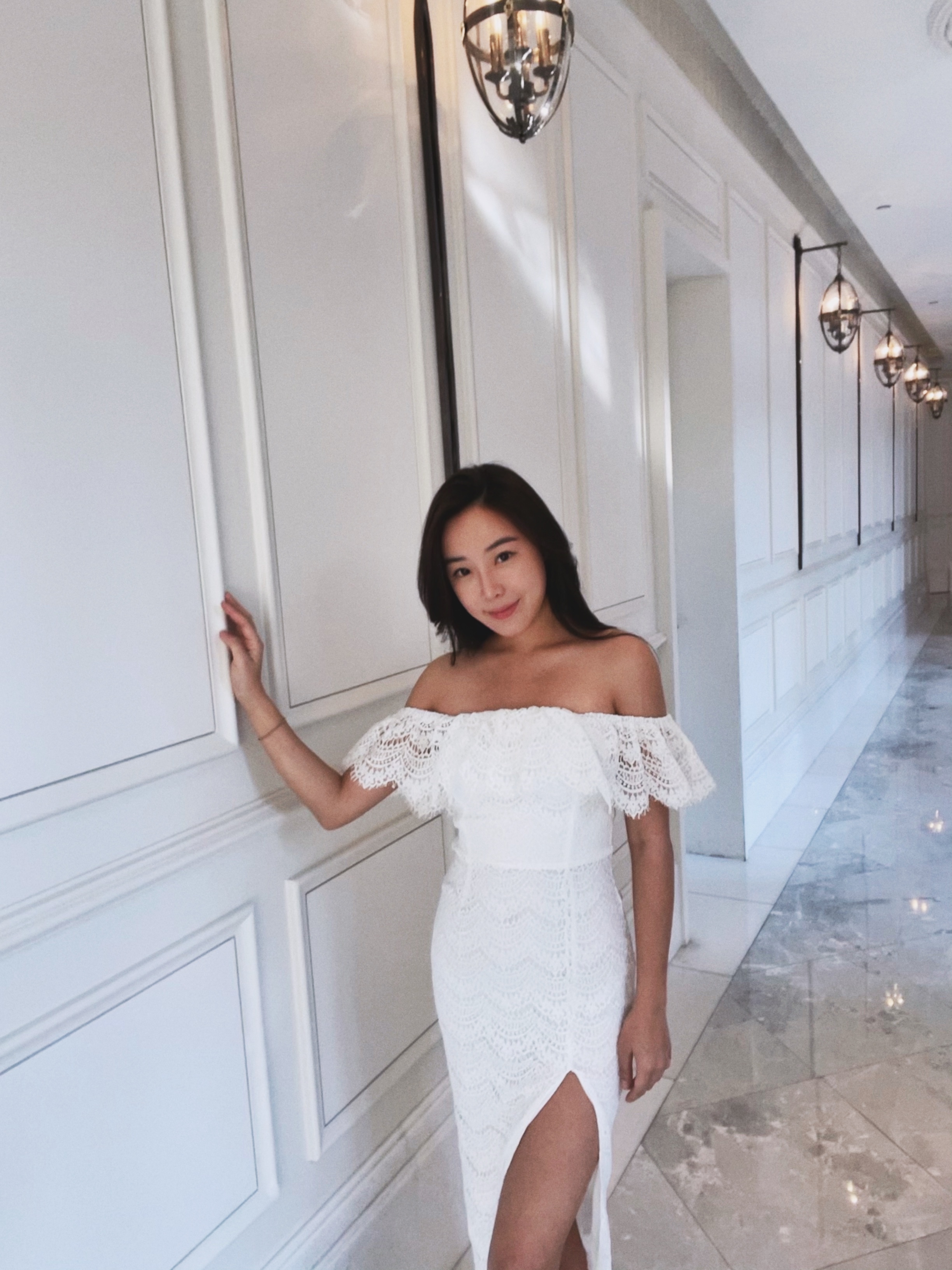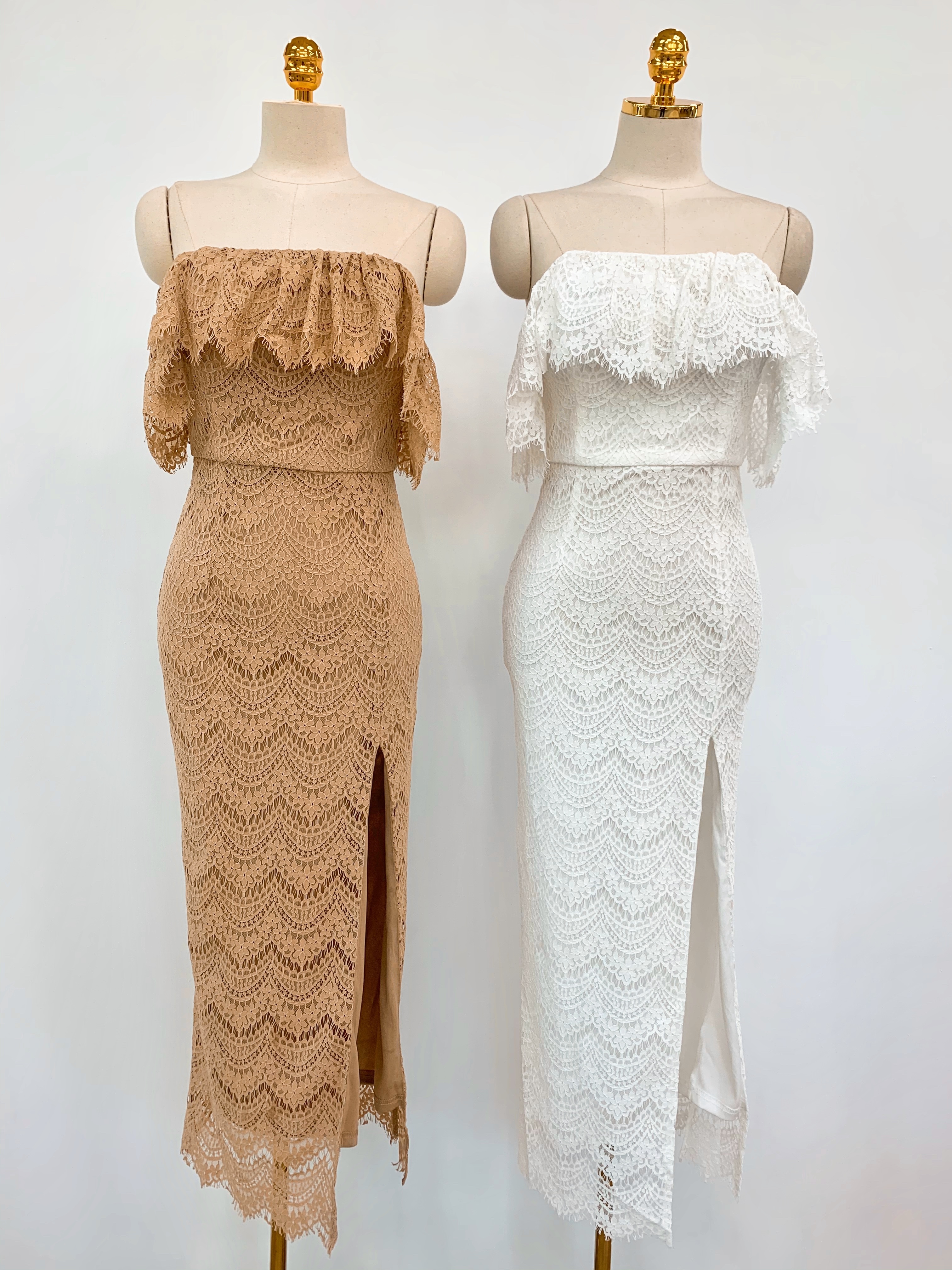 At last 一字領蕾絲開衩洋裝