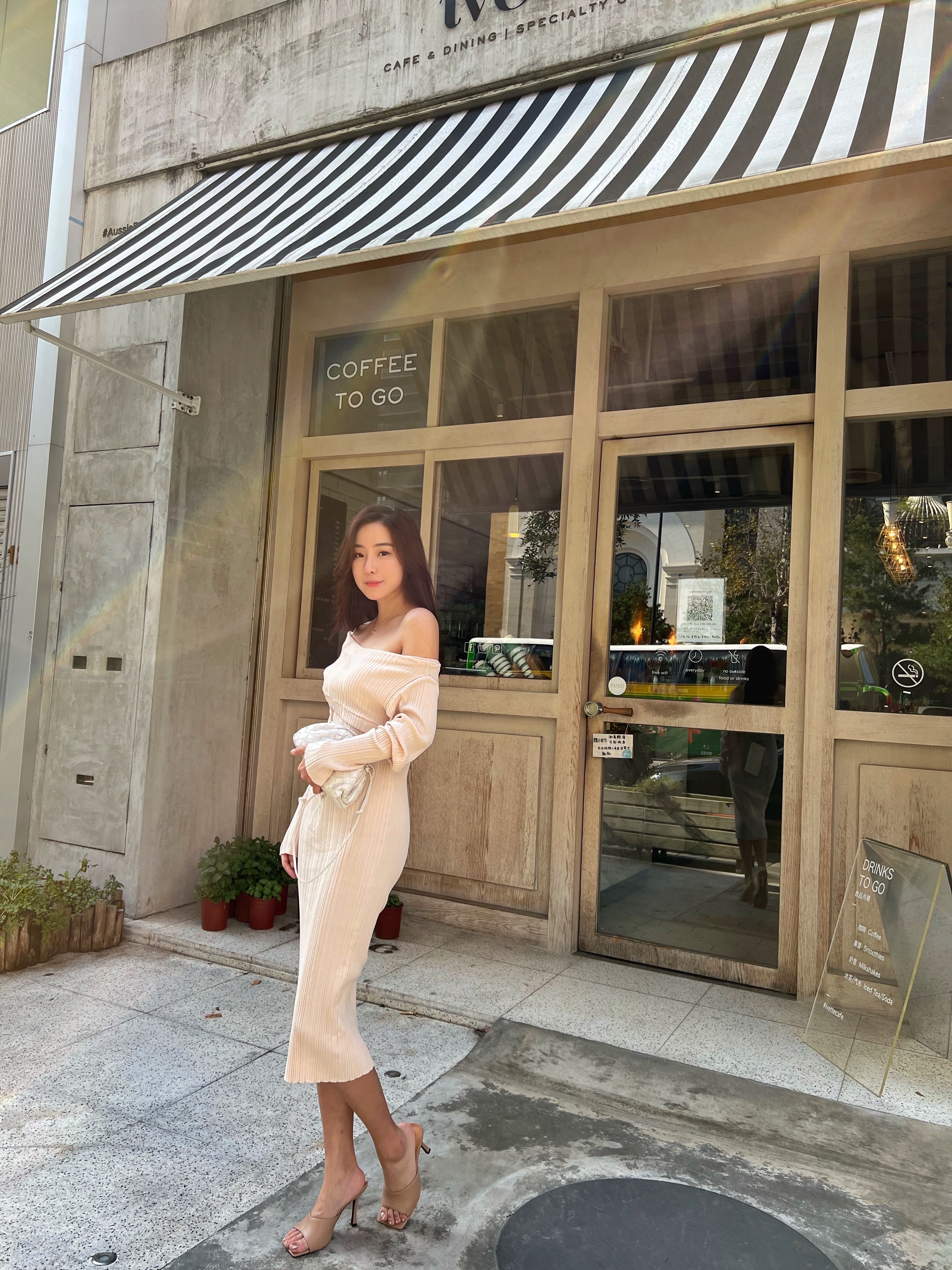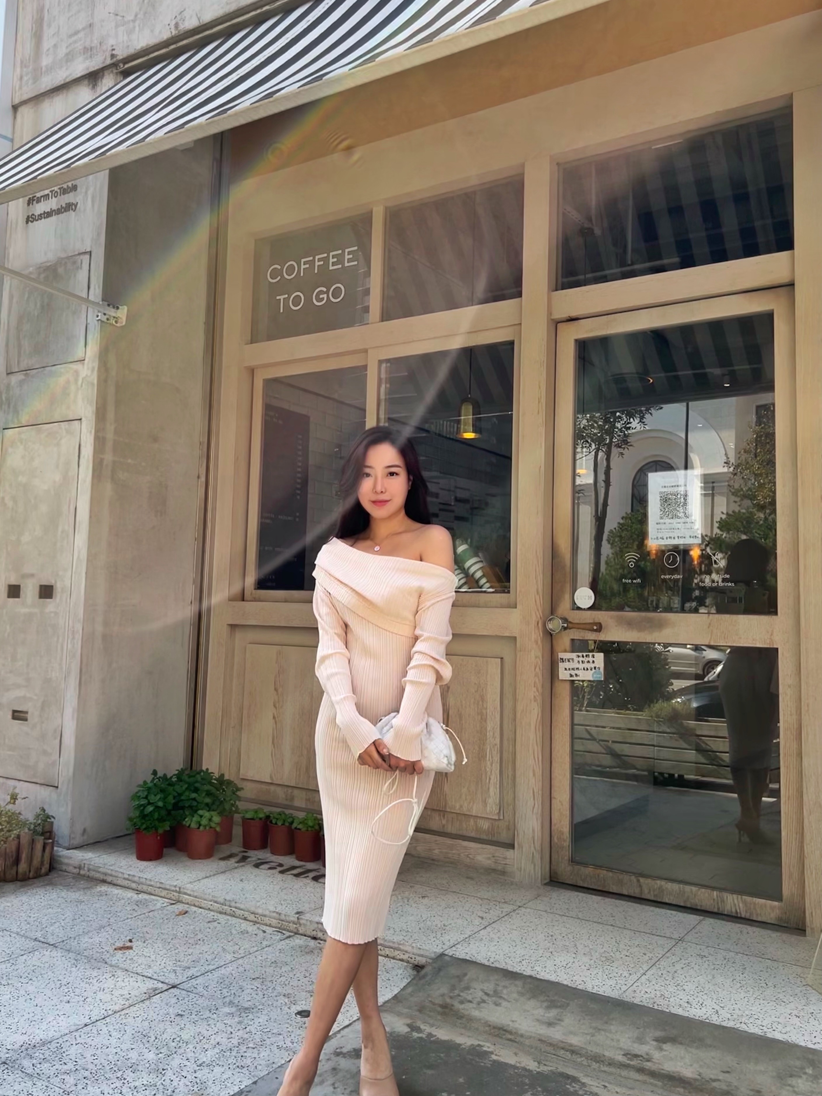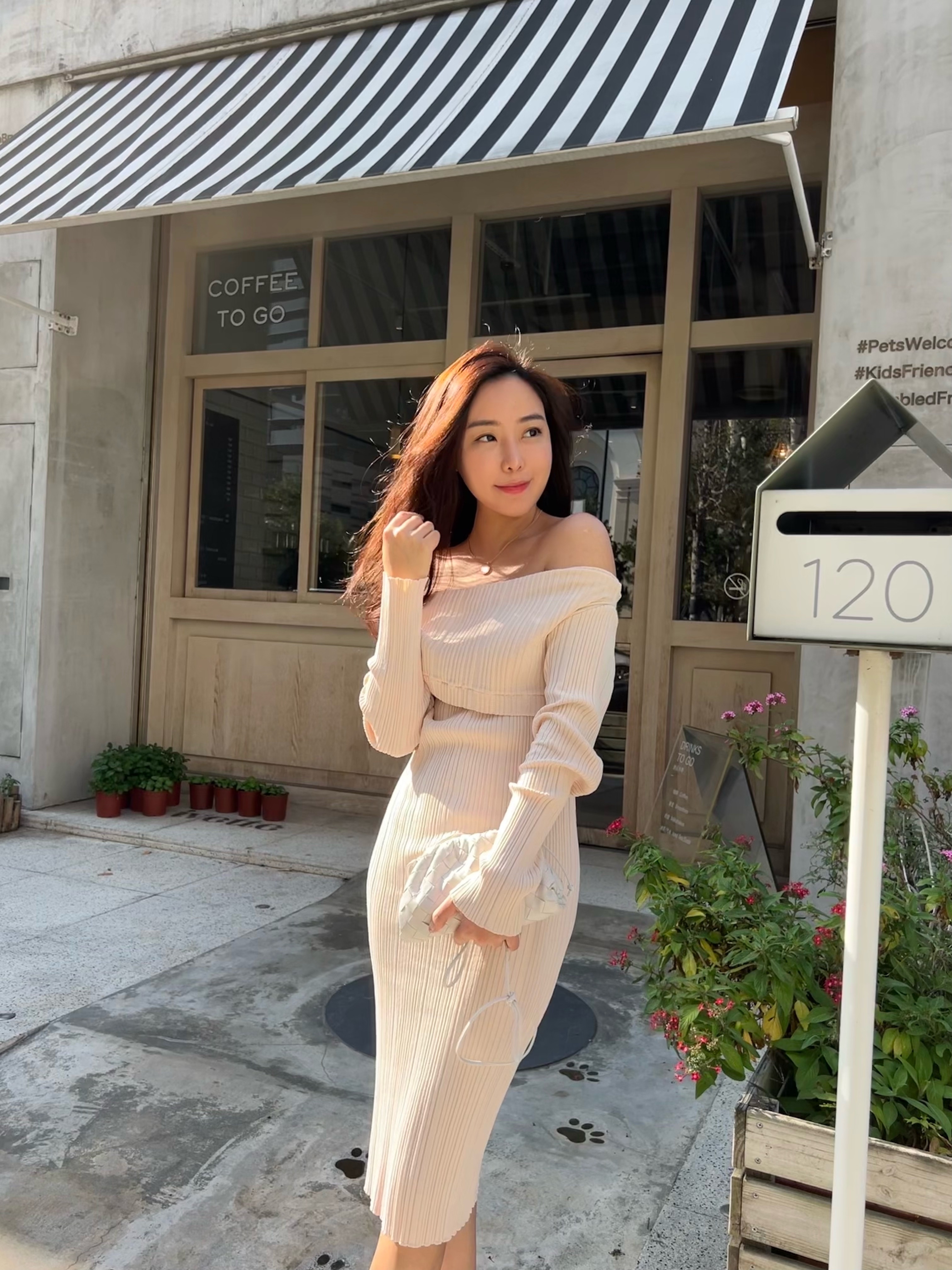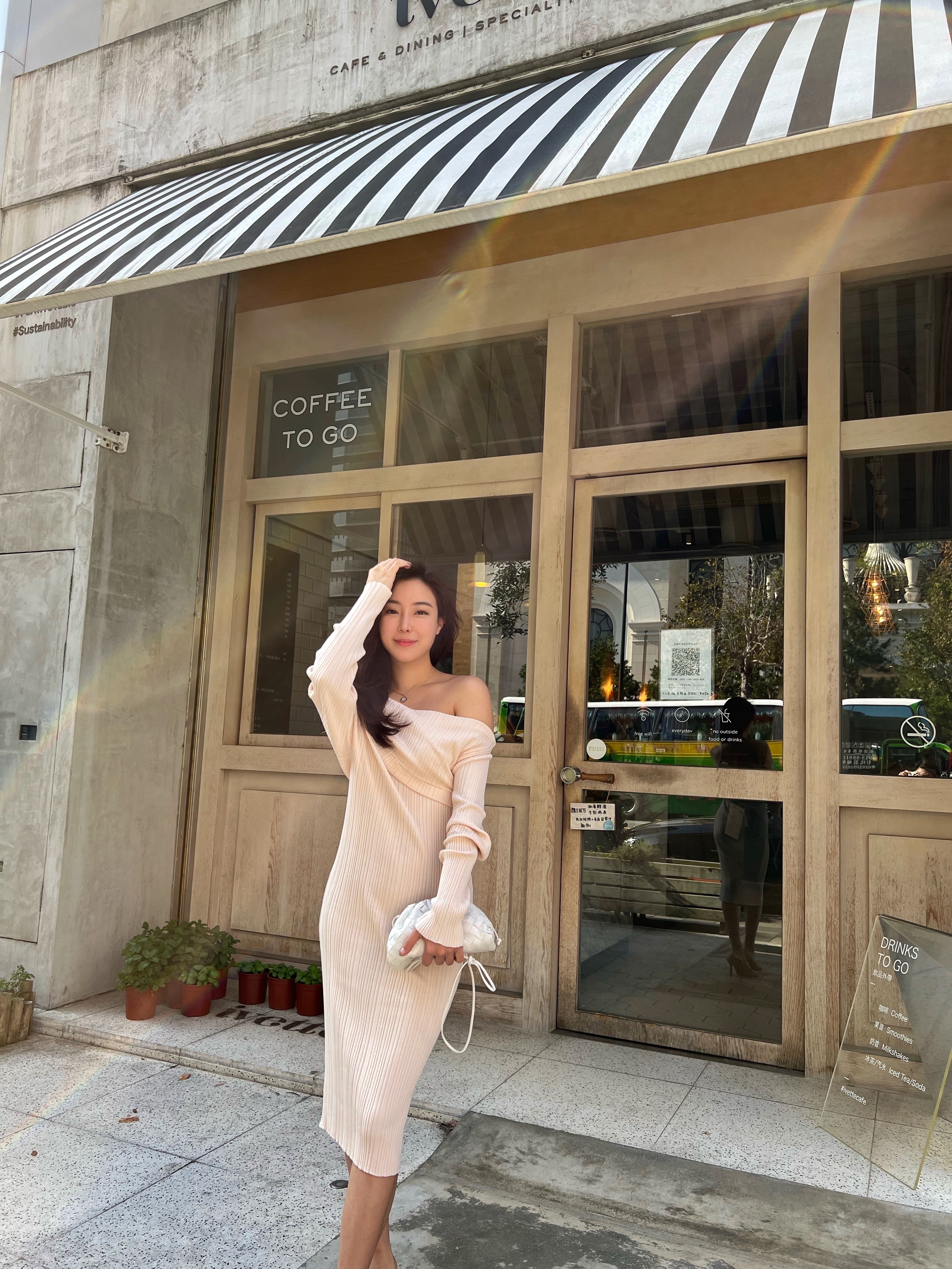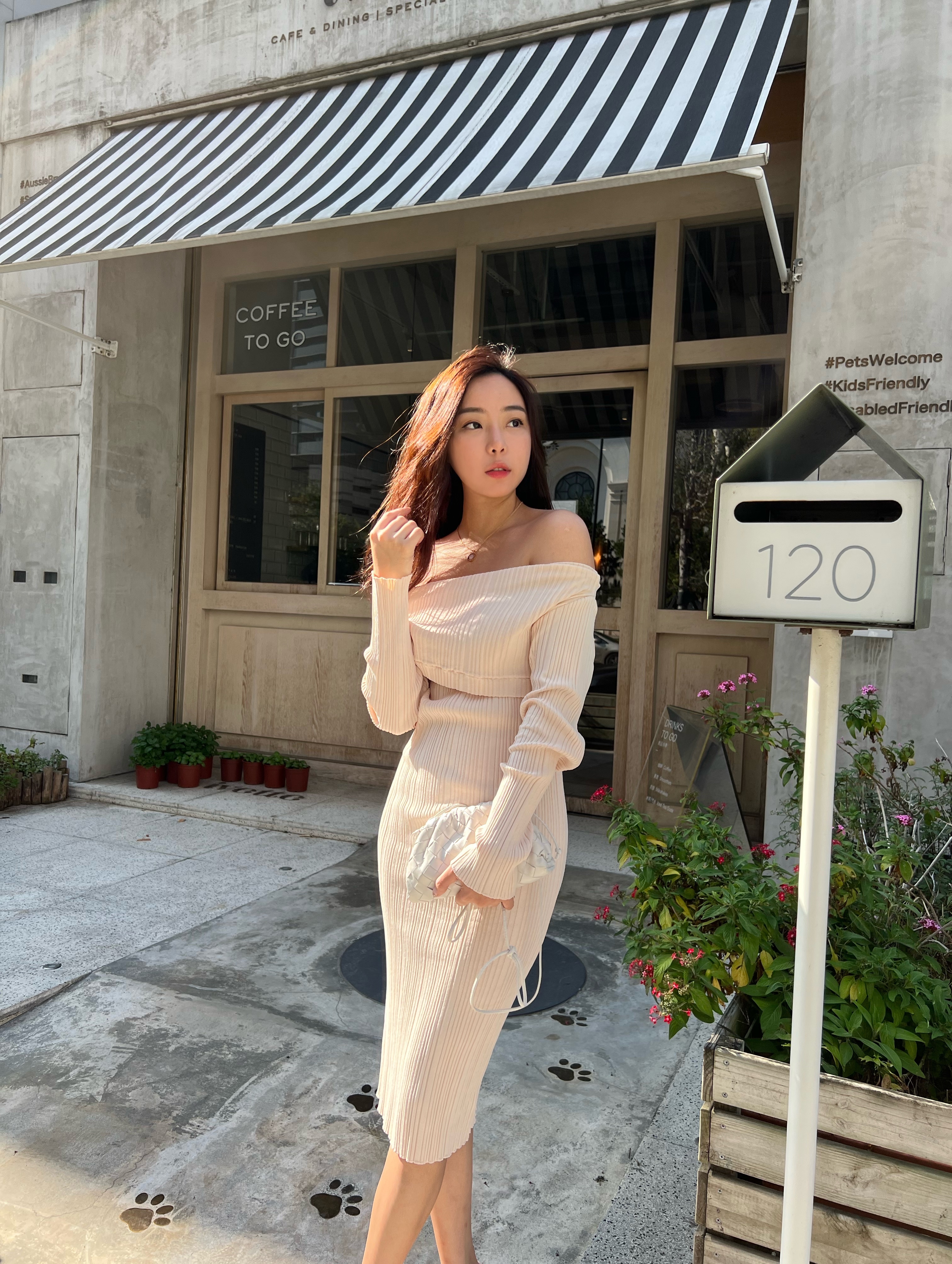 穿上杏色的針織洋裝