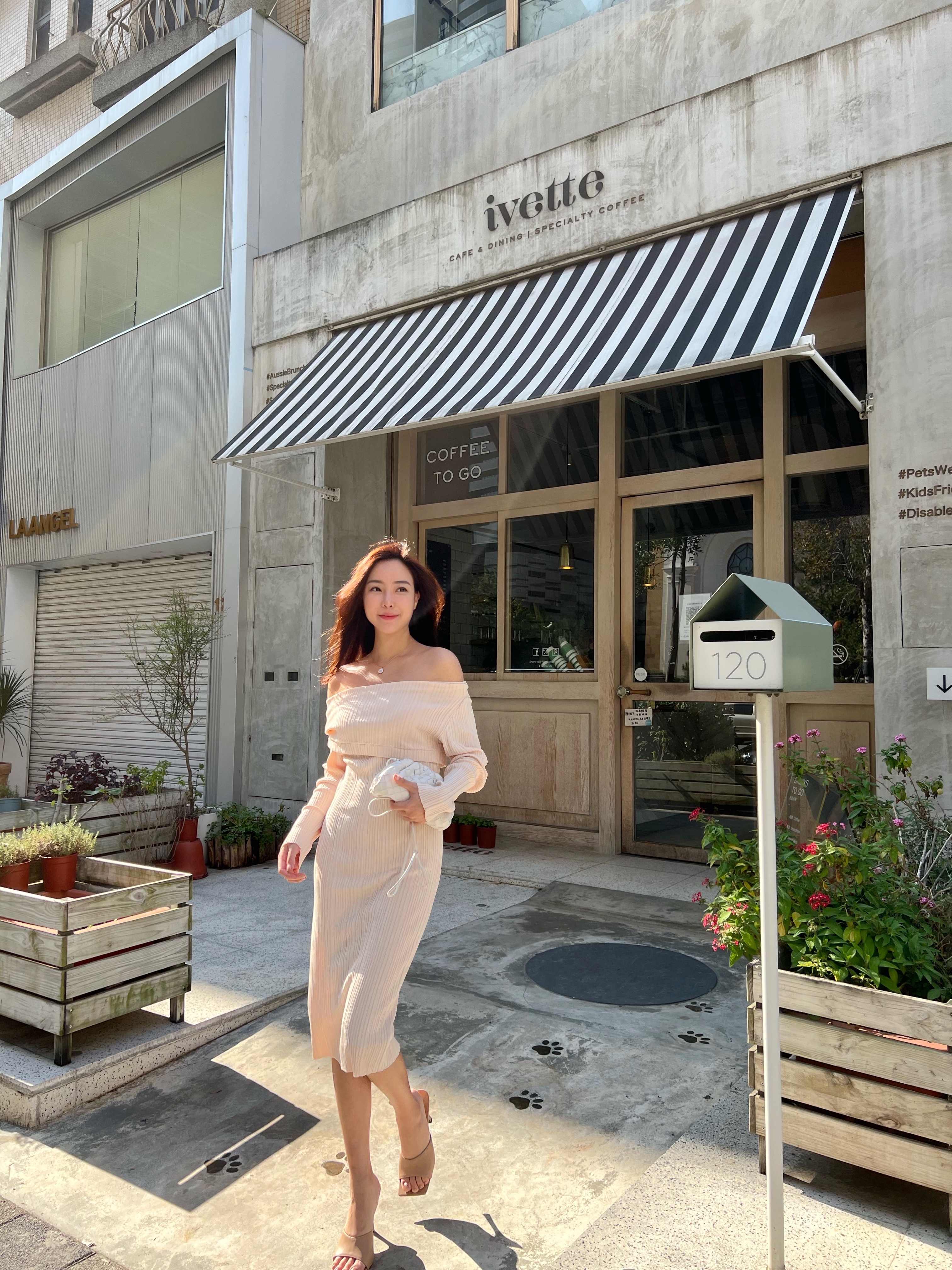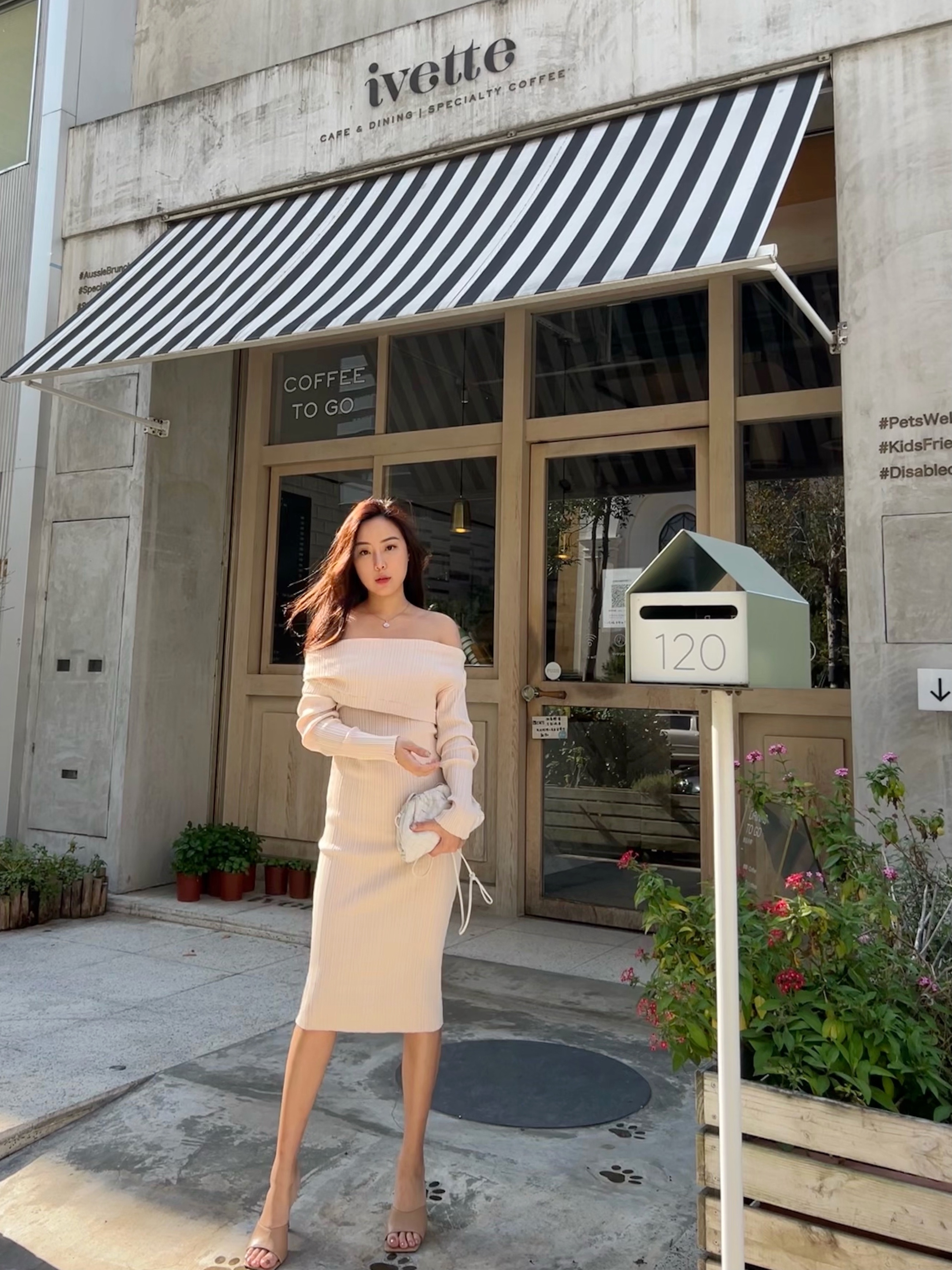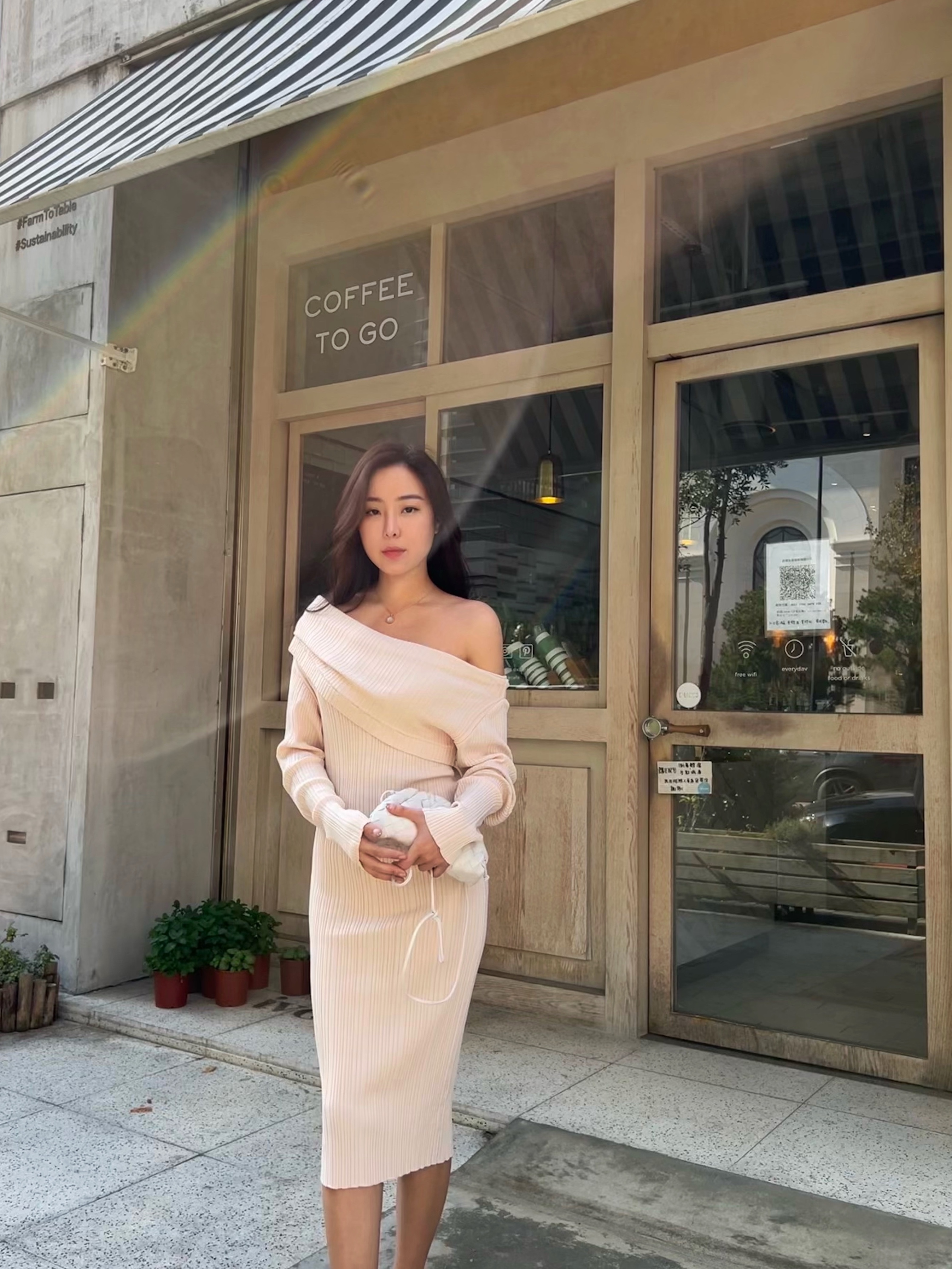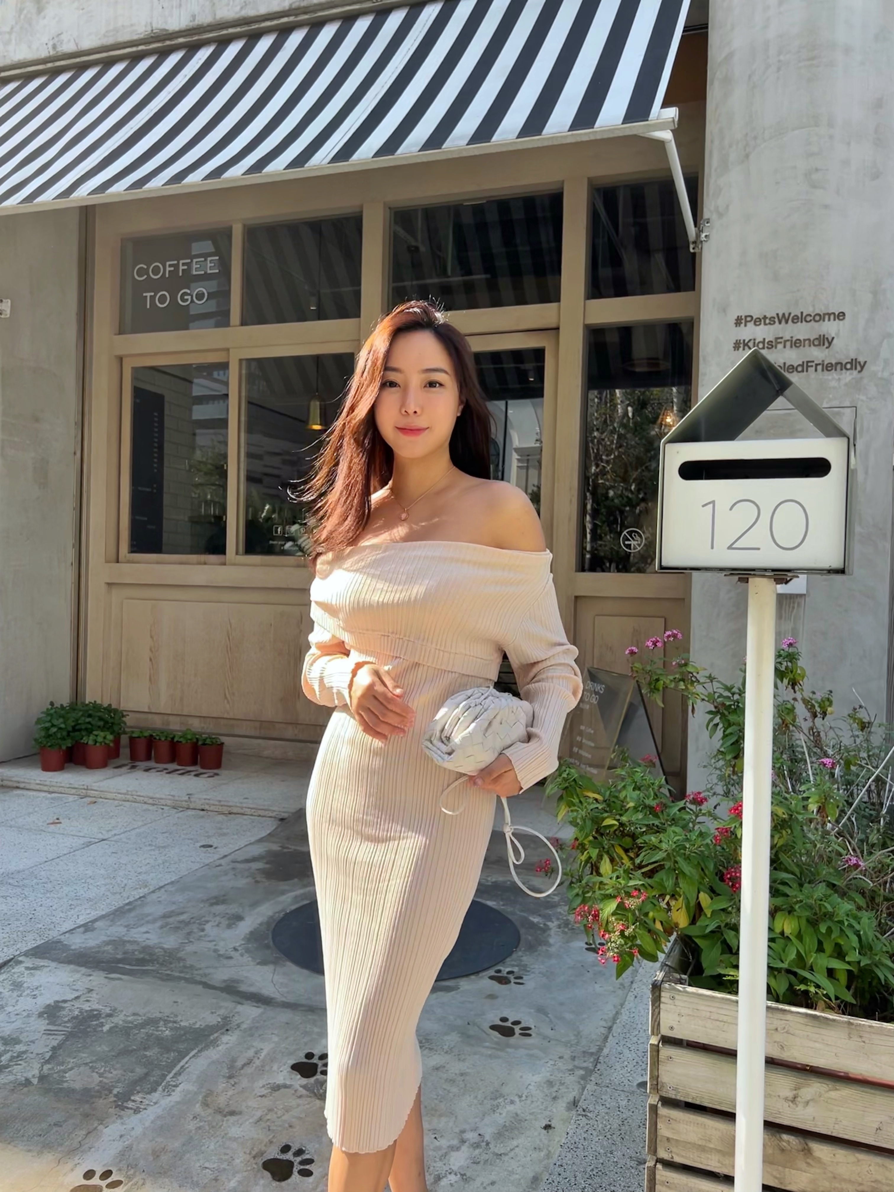 穿上杏色的針織洋裝
