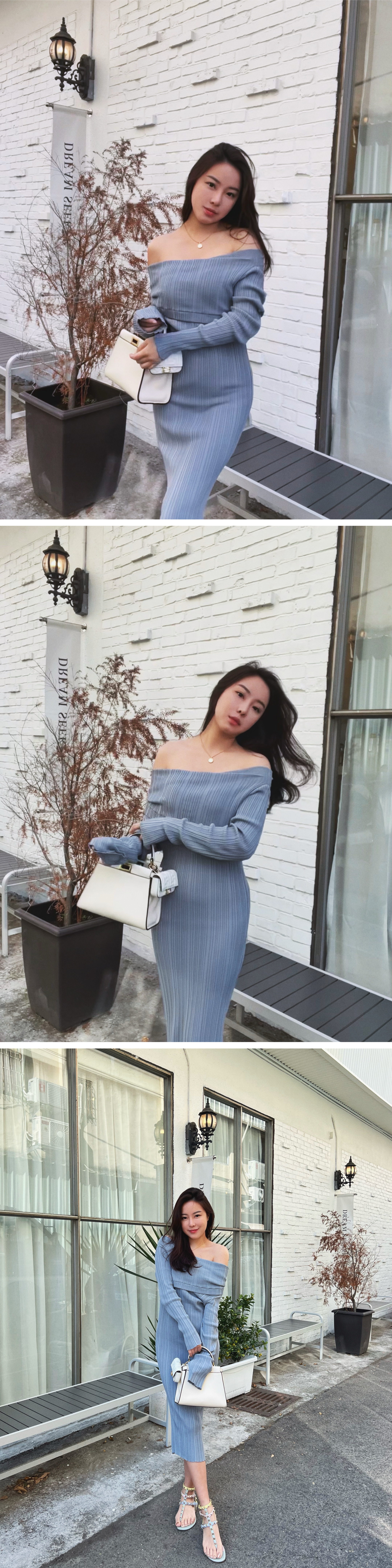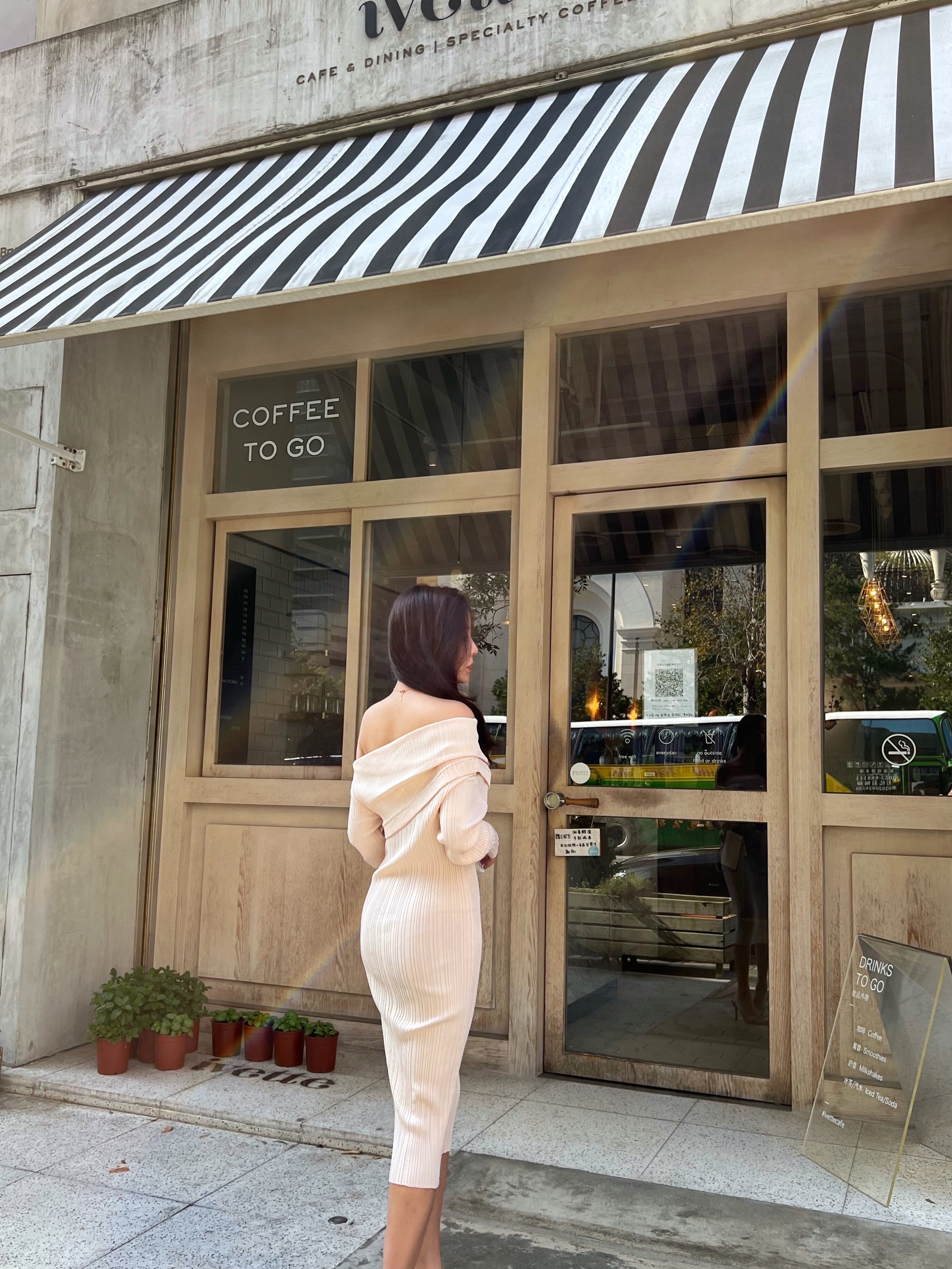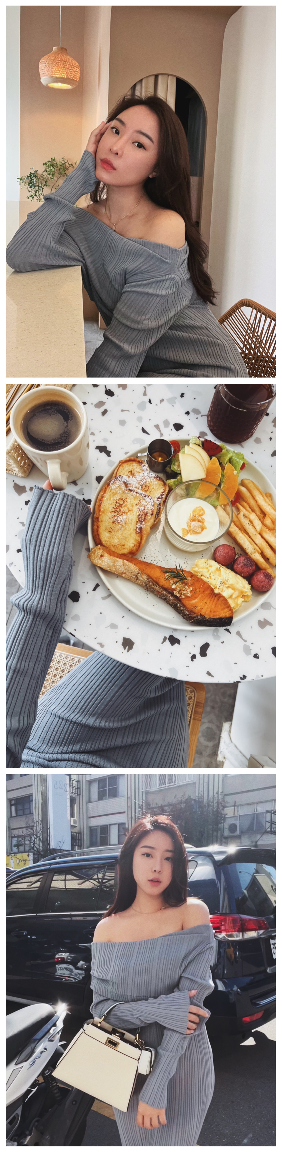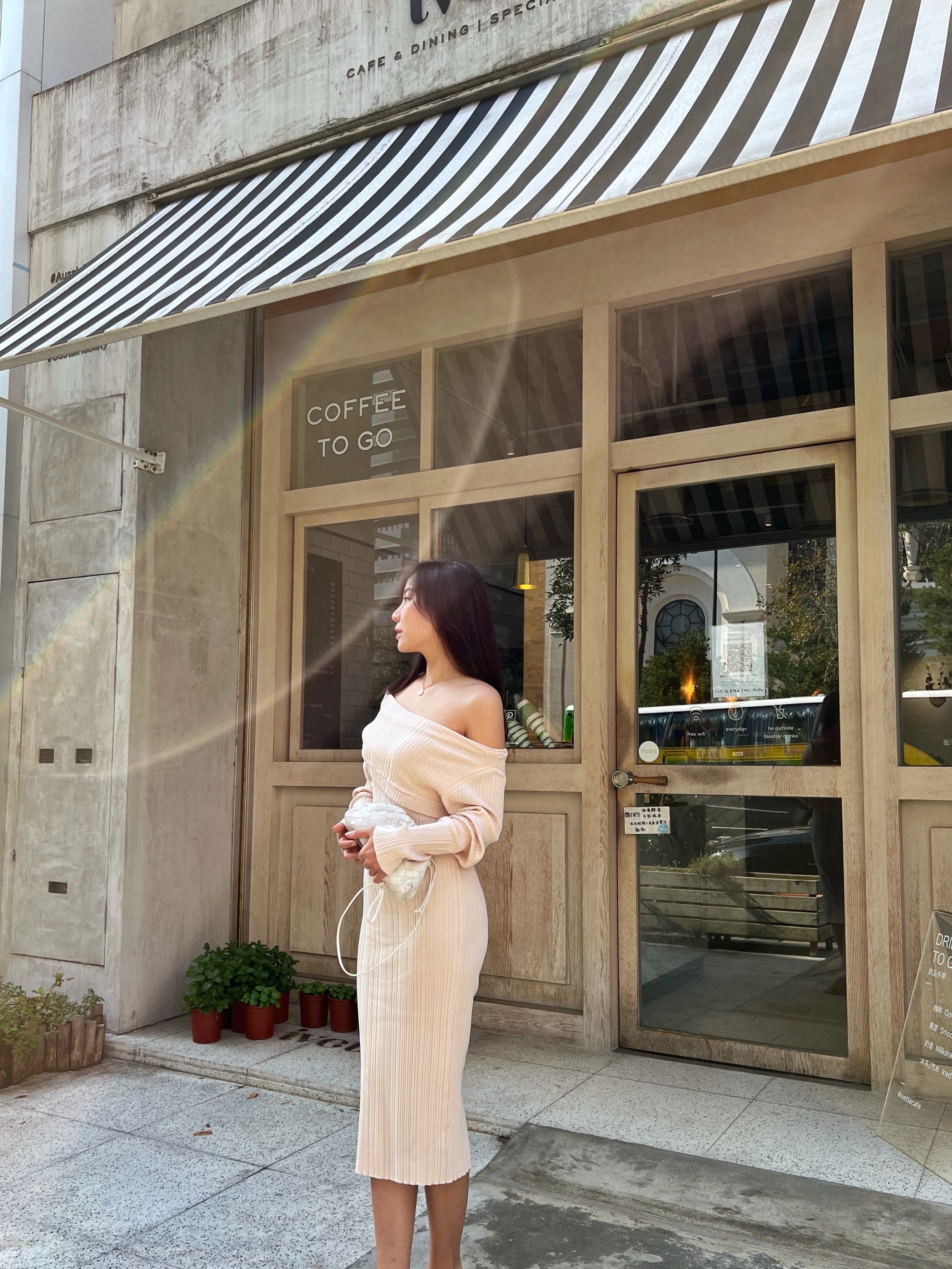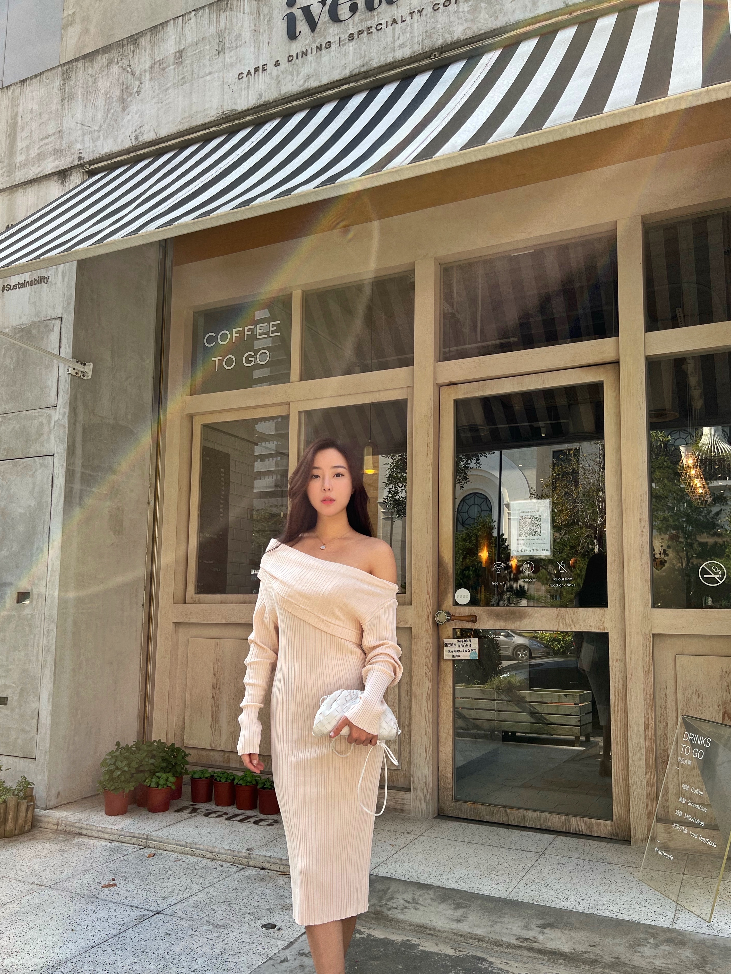 穿上杏色的針織洋裝