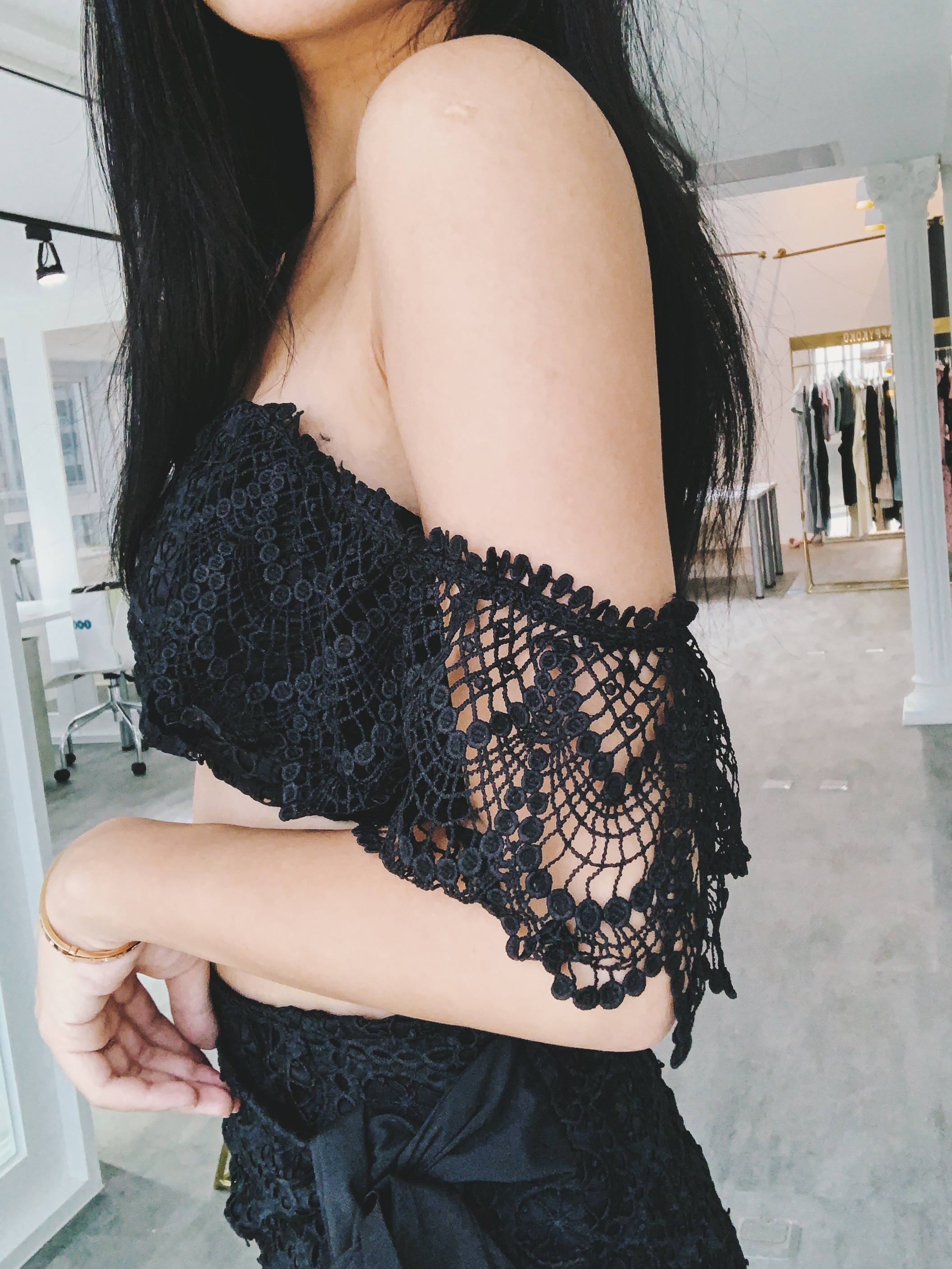 上身是一字領設計,兩旁的袖子自然垂墜,微微透膚小性感😳😳