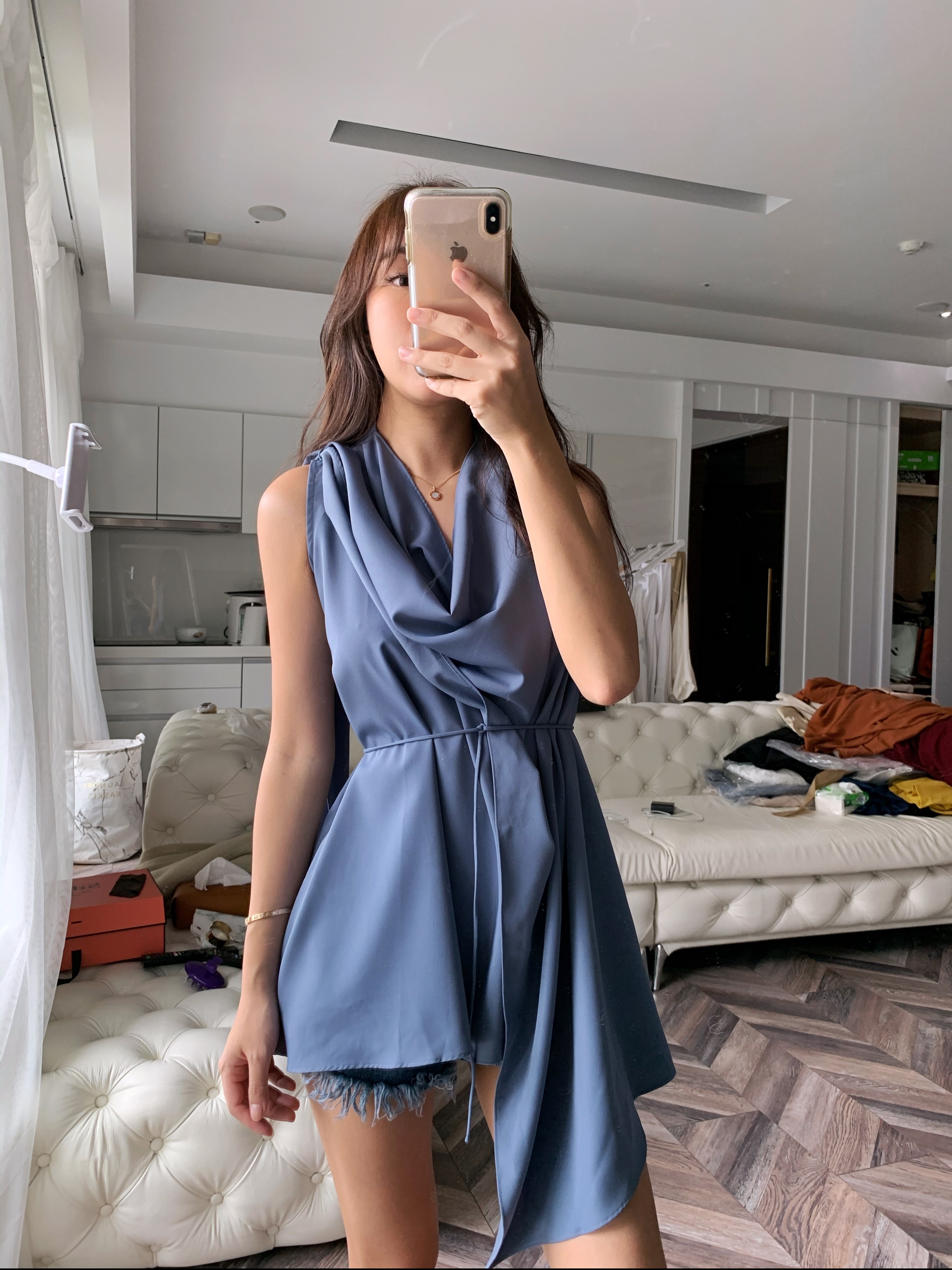 雪紡紗布料很輕盈,柔順的手感超級舒服😌細繩繞過腰部,隨性的綁成結就行囉~~